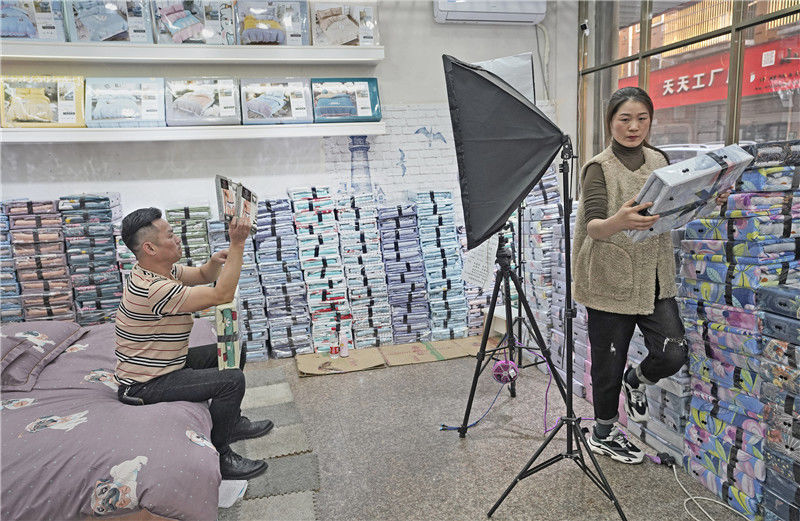 2019年11月10日,江金華,義烏北下朱村,在店鋪里直播銷售床上用品的兩個店員。