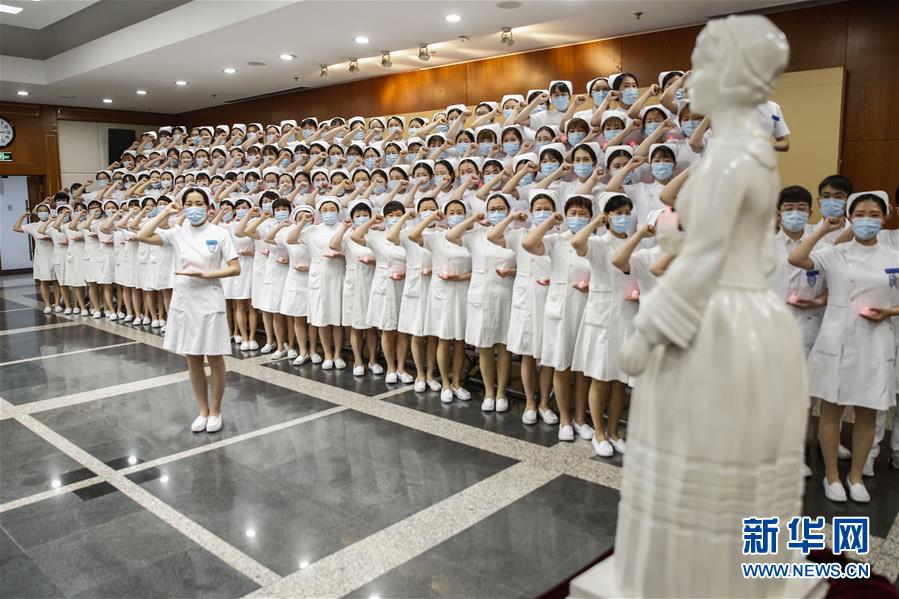 4月26日,北京大學人民醫(yī)院新入職護士參加授帽儀式。當日,北京大學人民醫(yī)院為97名2019屆新入職護士舉行隆重莊嚴的授帽儀式和重溫南丁格爾誓言的活動,以此紀念南丁格爾誕辰200周年和即將到來的“國際護士節(jié)”?;顒舆€邀請了5名援鄂國家醫(yī)療隊護士代表分享戰(zhàn)“疫”故事。新華社記者張玉薇攝