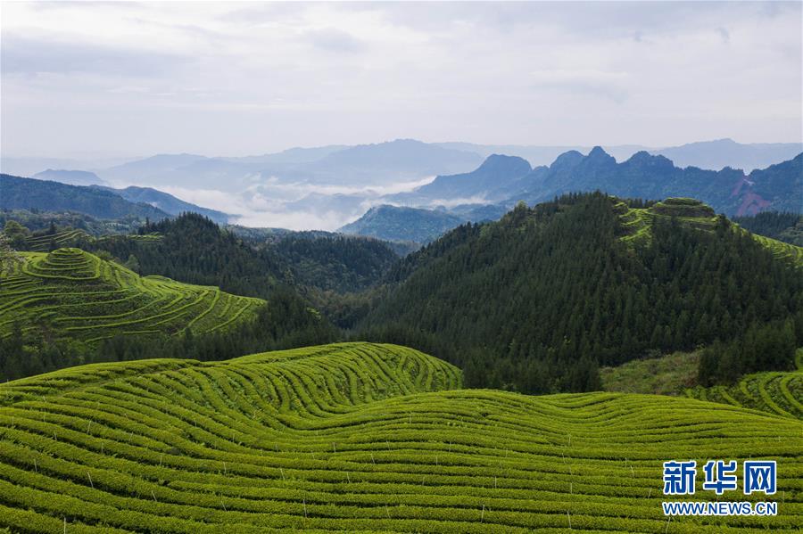 俯瞰鹿鳴茶海一角(4月28日無人機(jī)照片)。四川省珙縣的鹿鳴茶海,常年云霧繚繞,茶壟依山分布,美不勝收。新華社記者江宏景攝