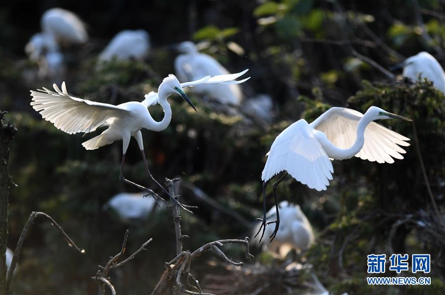 白鷺在位于鄱陽湖畔的南昌市象山森林公園內(nèi)棲息(4月27日攝)。近日,在江西省南昌市新建區(qū)象山森林公園內(nèi),已安家筑巢的大批白鷺進入繁殖旺季。在夕陽的照耀下,白鷺時而翩翩起舞,時而展翅盤旋,構(gòu)成一幅美麗的自然生態(tài)畫卷。新華社記者萬象攝