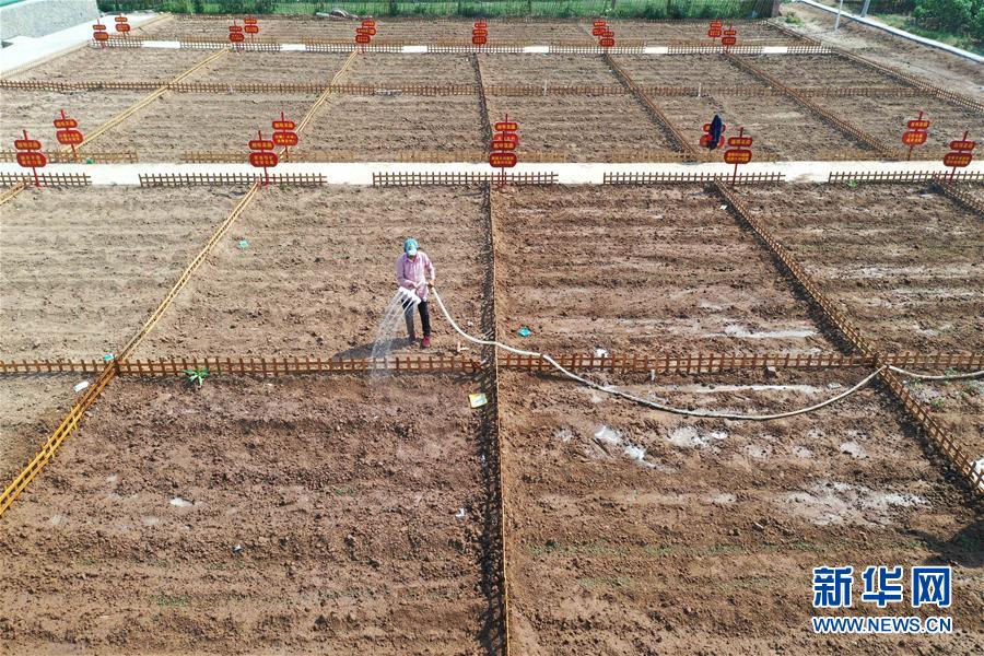 5月1日,村民在河南省鶴壁市淇濱區(qū)鉅橋鎮(zhèn)崗坡村共享菜園里澆水(無人機照片)。 新華社記者馮大鵬攝