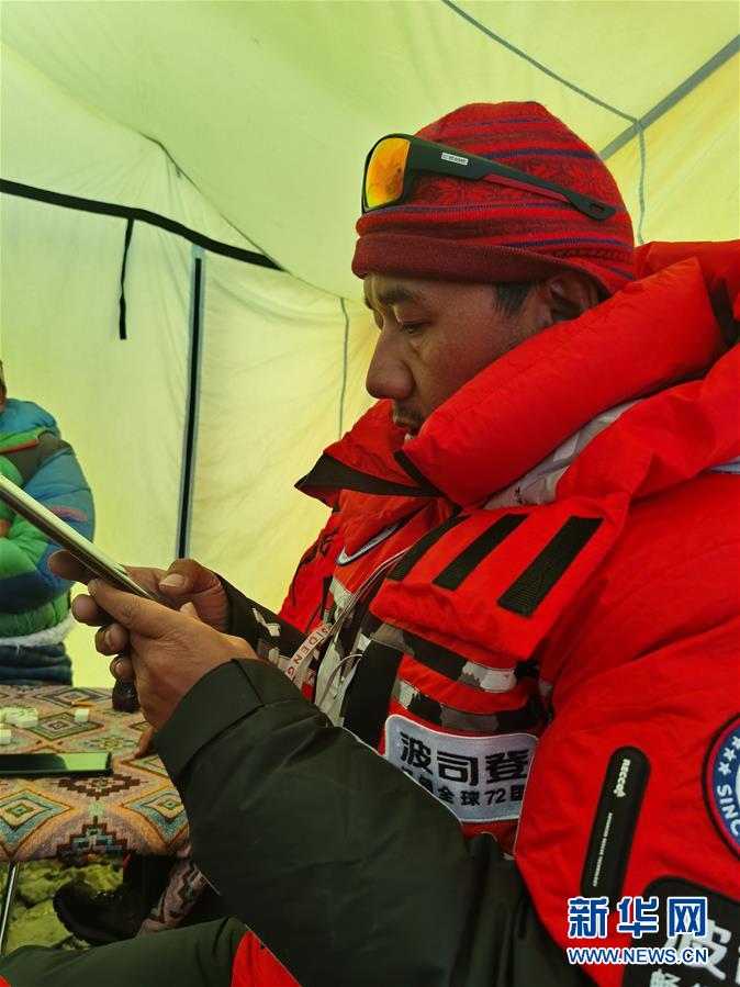 5月7日,登山隊(duì)隊(duì)長(zhǎng)次洛在前進(jìn)營(yíng)地查看攀登計(jì)劃。當(dāng)日,2020珠峰高程測(cè)量登山隊(duì)抵達(dá)海拔6500米的前進(jìn)營(yíng)地后,測(cè)量登山隊(duì)同由西藏圣山登山探險(xiǎn)服務(wù)有限公司的高山向?qū)Ш蛥f(xié)作隊(duì)員組成的修路隊(duì)、運(yùn)輸隊(duì)召開(kāi)協(xié)調(diào)會(huì)議,布置下一步任務(wù)。新華社特約記者扎西次仁攝