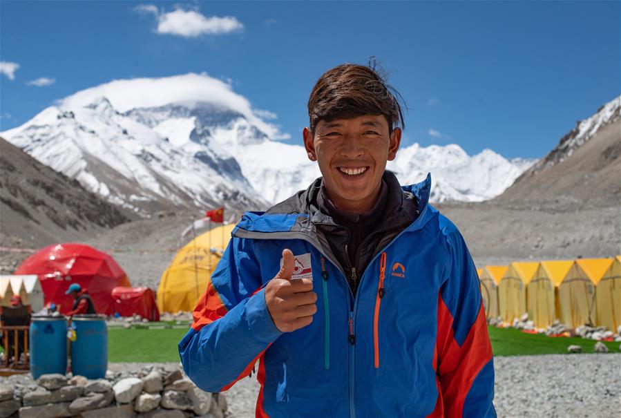 西藏圣山公司高山向?qū)赚旑D珠在珠峰大本營(5月8日攝)。5月8日是世界微笑日。在海拔5200米的珠峰大本營,參與2020珠峰高程測量的各方人員,微笑期待本次測量活動的圓滿成功。
