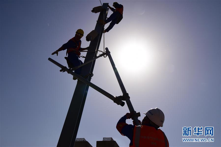 5月10日,中鐵電氣化局工程人員在鄭州新鄭機場至鄭州南站城際鐵路工地施工。新華社記者朱祥攝