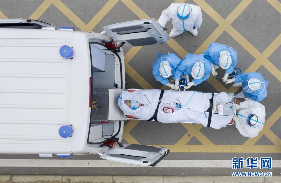 在華中科技大學附屬同濟醫(yī)院中法新城院區(qū),醫(yī)護人員護送一名剛做完CT檢查的新冠肺炎重癥患者上負壓救護車(3月6日攝,無人機照片)。新華社記者才揚攝