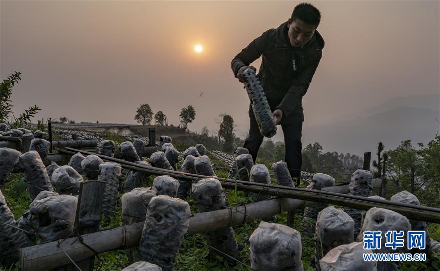 農戶王九才在木耳種植基地整理木耳菌包(3月27日攝)。新華社記者江文耀攝