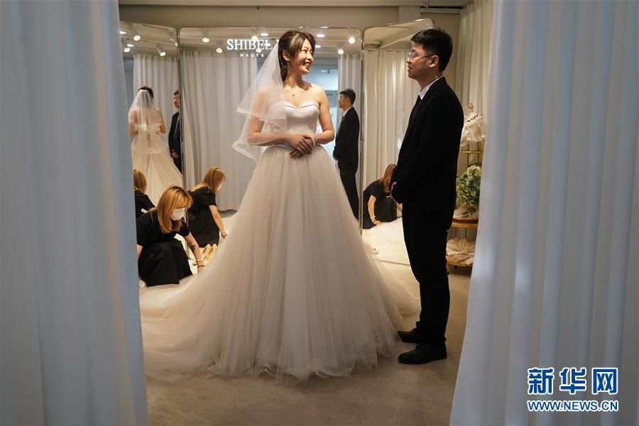 5月19日,江蘇省人民醫(yī)院重癥醫(yī)學(xué)科醫(yī)生王魏魏(中)在試婚紗。她曾在武漢兩家醫(yī)院的重癥病區(qū)奮戰(zhàn)45天。當(dāng)日,15對(duì)新人在江蘇南京集體拍攝婚紗照,并將參加5月20日在南京舉行的“今世緣白衣天使集體婚禮”。拍攝婚紗照的部分新人此前因馳援武漢或參加所在城市抗疫工作而推遲婚期。新華社記者季春鵬攝