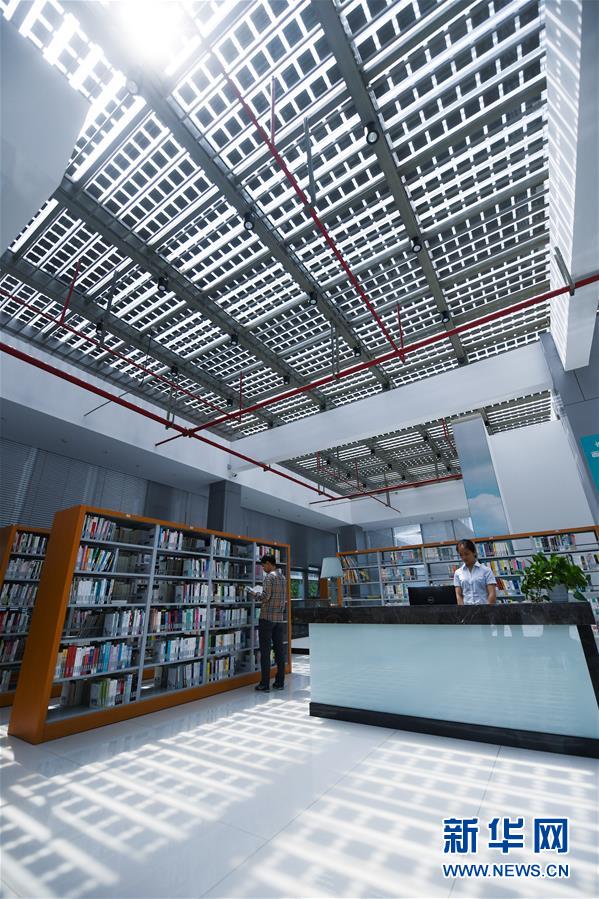 5月21日,市民在新能源小鎮(zhèn)“城市客廳”的圖書館內(nèi)看書。該圖書館頂部的光伏發(fā)電板可以隨時(shí)調(diào)整角度和開合,進(jìn)而控制室內(nèi)采光。新華社記者徐昱攝