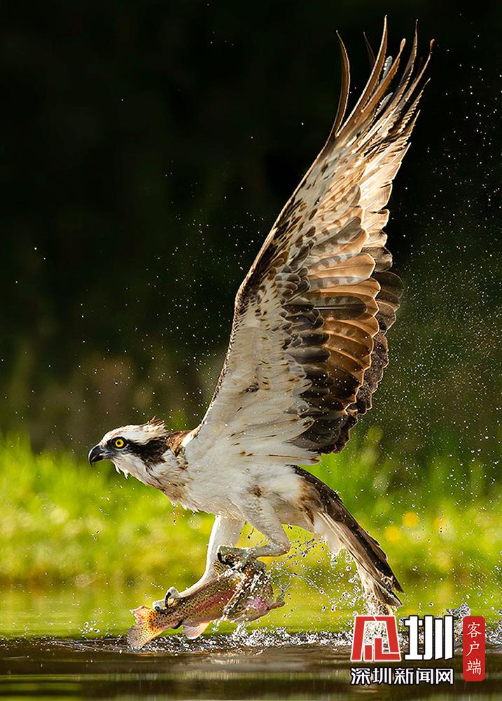 2020年5月28日報道(具體拍攝時間不詳),54歲的Gladys Klip來自荷蘭,是一名銀行助理,他在蘇格蘭高地拍攝到魚鷹捕魚的精彩照片。畫面中,魚鷹快速俯沖而下,掠過水面,鷹爪隨即從水中成功抓起一條魚兒,濺起水花,整個過程精彩詮釋快準(zhǔn)狠。Gladys Klip稱他在早晨5點的時候已經(jīng)在等候拍攝。