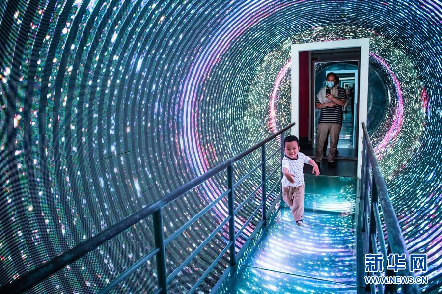 6月1日,小朋友在貴州科技館內(nèi)體驗“時光隧道”。