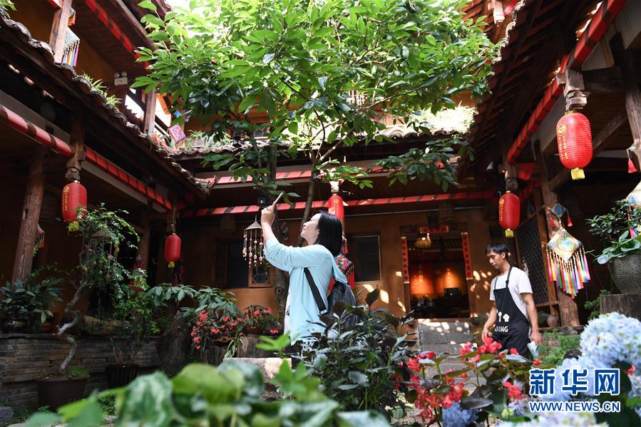 6月2日,游客在云南丘北縣普者黑仙人洞村一家客棧內拍照。新華社記者楊宗友攝。
