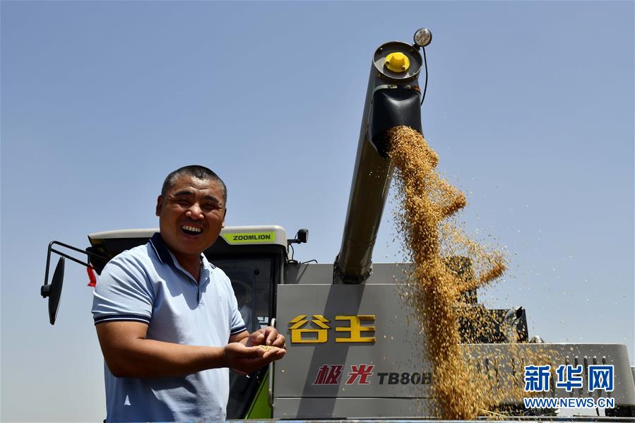 6月3日,在汶上縣郭倉(cāng)鎮(zhèn),種糧大戶(hù)郭波波在收獲小麥。目前,我國(guó)第二大小麥主產(chǎn)區(qū)山東6000多萬(wàn)畝小麥進(jìn)入收獲階段。農(nóng)民們搶抓有利天氣,自南向北陸續(xù)開(kāi)鐮。新華社記者郭緒雷攝。