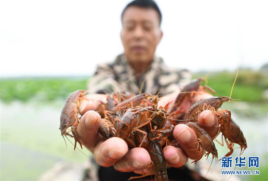 6月9日,在宿遷市宿城區(qū)中揚鎮(zhèn)一家淺水藕套養(yǎng)小龍蝦合作社,負責人王乃國在展示蝦苗(無人機照片)。新華社記者季春鵬攝