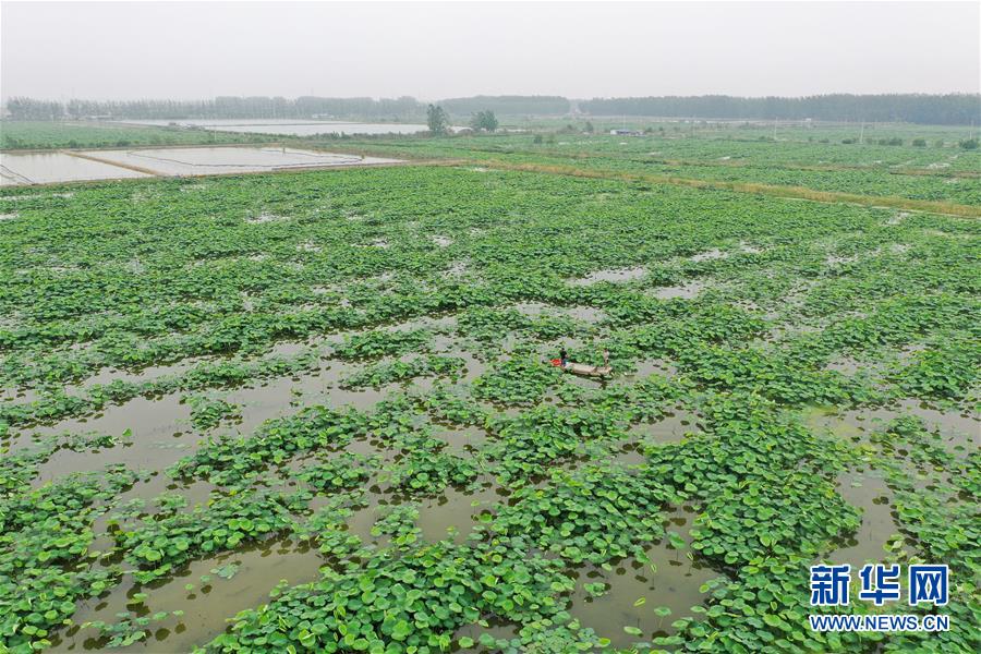 6月9日,在宿遷市宿城區(qū)中揚鎮(zhèn)一家淺水藕套養(yǎng)小龍蝦合作社,負責人王乃國在取蝦苗(無人機照片)。新華社記者季春鵬攝