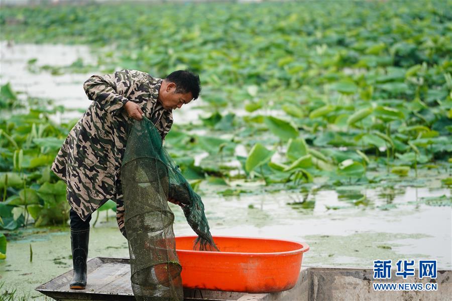 6月9日,在宿遷市宿城區(qū)中揚鎮(zhèn)一家淺水藕套養(yǎng)小龍蝦合作社,工人在給小龍蝦喂飼料。新華社記者季春鵬攝