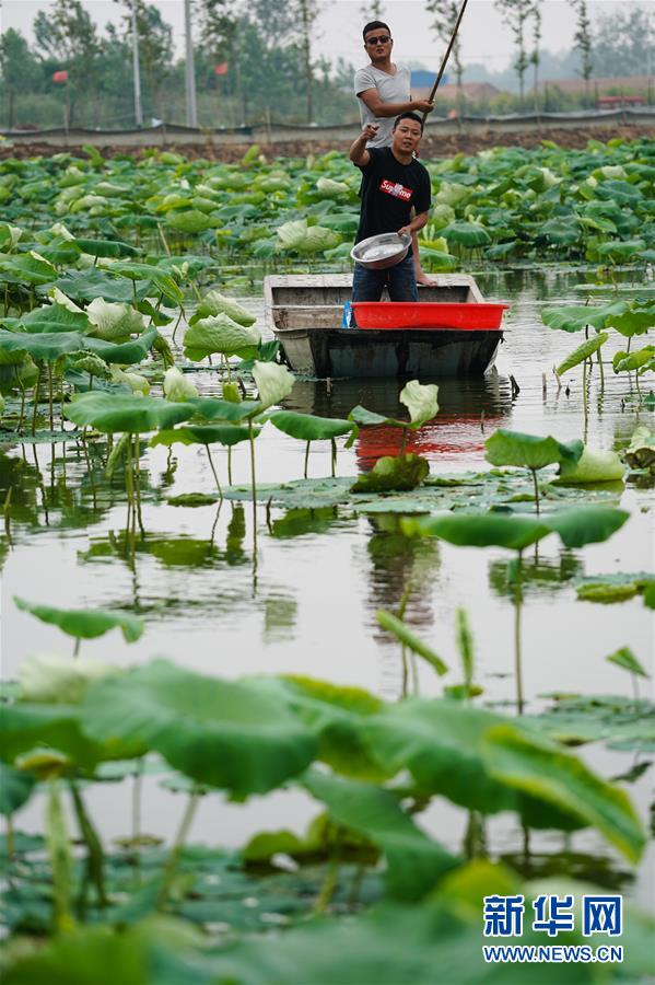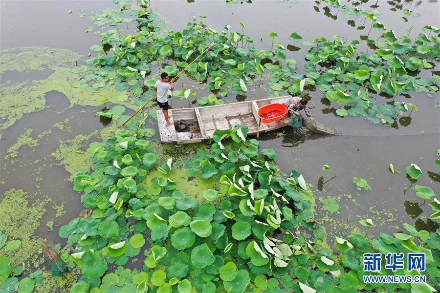 6月9日,在宿遷市宿城區(qū)中揚鎮(zhèn)一家淺水藕套養(yǎng)小龍蝦合作社,負責人王乃國(右)在取蝦苗(無人機照片)。新華社記者季春鵬攝