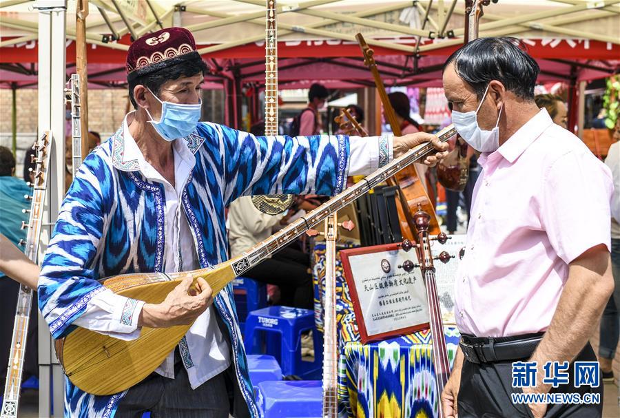 6月12日,在位于烏魯木齊大巴扎景區(qū)內(nèi)的活動(dòng)現(xiàn)場,新疆維吾爾自治區(qū)非物質(zhì)文化遺產(chǎn)傳承人艾爾肯·吐么爾(左)在“維吾爾族樂器制作技藝”非遺項(xiàng)目展區(qū)演奏都塔爾。6月12日,“文旅融合,文物賦彩,非遺傳承,健康生活”2020年烏魯木齊市天山區(qū)文化和自然遺產(chǎn)日推介展演活動(dòng)在大巴扎景區(qū)舉辦,吸引不少游客和市民觀賞。新華社記者王菲攝。
