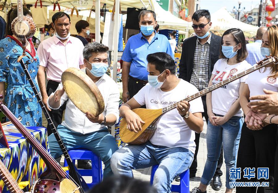 6月12日,在位于烏魯木齊大巴扎景區(qū)內的活動現(xiàn)場,游客在“維吾爾族樂器制作技藝”非遺項目展區(qū)體驗民族樂器彈奏。6月12日,“文旅融合,文物賦彩,非遺傳承,健康生活”2020年烏魯木齊市天山區(qū)文化和自然遺產(chǎn)日推介展演活動在大巴扎景區(qū)舉辦,吸引不少游客和市民觀賞。新華社記者王菲攝。