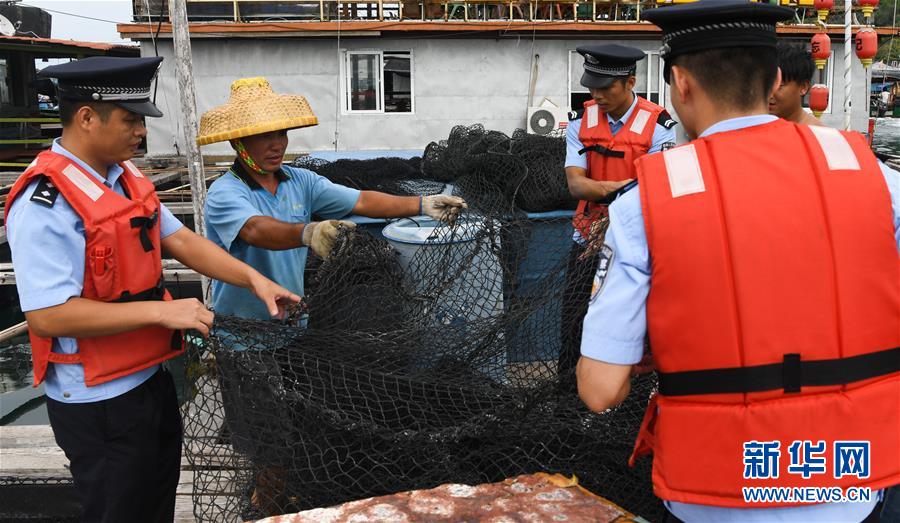 6月13日,海南省公安廳海岸警察總隊(籌備組)陵水支隊民警幫助轄區(qū)內(nèi)漁民整理漁網(wǎng)。當(dāng)日,海南省氣象局于16時30分繼續(xù)發(fā)布臺風(fēng)四級預(yù)警。今年第2號臺風(fēng)“鸚鵡”(熱帶風(fēng)暴級)預(yù)計于14日在廣東沿海登陸。新華社記者楊冠宇攝。
