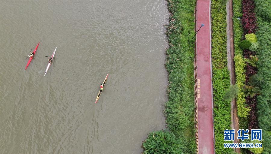 6月15日,劃艇運動員在茅洲河上訓(xùn)練(無人機(jī)照片)。新華社記者 鄧華 攝