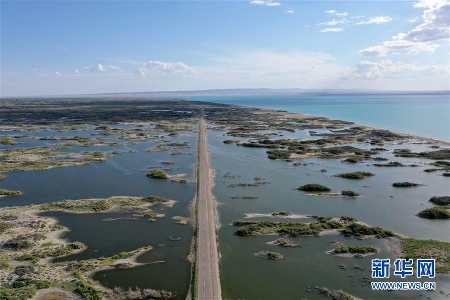 6月18日拍攝的新疆烏倫古湖國家濕地公園(無人機照片)。烏倫古湖國家濕地公園位于新疆阿勒泰地區(qū)福??h城以西,由烏倫古湖和吉力湖兩部分組成。烏倫古湖濕地公園是遷徙候鳥飛越天山和阿爾泰山的“能量補充站”,良好的濕地生態(tài)吸引著大量遷徙鳥類在此集結(jié)成群,繁殖棲息,成為一道靚麗的風(fēng)景線。新華社記者 沙達提 攝