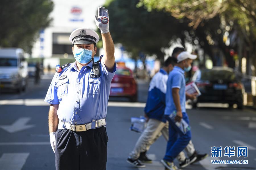 6月20日,在烏魯木齊市第二中學(xué)門前,烏魯木齊市公安局交警支隊(duì)天山區(qū)大隊(duì)新華路中隊(duì)警官艾力夏提·哈力木然提在指揮交通。當(dāng)日,烏魯木齊市初中升高中考試開始。為保障為期三天的中考順利進(jìn)行,烏魯木齊市公安局交警支隊(duì)在各考點(diǎn)執(zhí)勤,為考生保駕護(hù)航新華社記者 王菲 攝