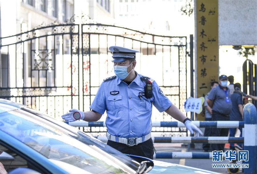 6月20日,在烏魯木齊市第二中學(xué)門前,烏魯木齊市公安局交警支隊天山區(qū)大隊新華路中隊警官羅曉亮在指揮交通。當(dāng)日,烏魯木齊市初中升高中考試開始。為保障為期三天的中考順利進(jìn)行,烏魯木齊市公安局交警支隊在各考點(diǎn)執(zhí)勤,為考生保駕護(hù)航新華社記者 王菲 攝