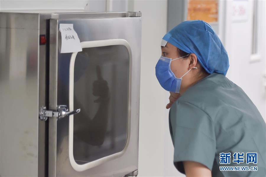 6月19日,在北京地壇醫(yī)院隔離病房外,護士和病人溝通,做著打電話的手勢。新華社記者彭子洋攝