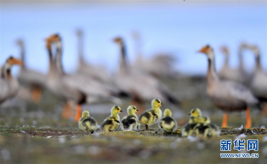 6月9日拍攝的西藏安多縣境內(nèi)嘎龍湖鳥島上的斑頭雁雛鳥。夏季的藏北高原氣候涼爽,生機盎然。經(jīng)過一個冬季在藏南的生活,斑頭雁、紅嘴鷗、黑頸鶴等紛紛遷徙至藏北深處的西藏安多縣嘎龍湖鳥島,在此棲息、產(chǎn)蛋、孵蛋。新華社記者覺果攝