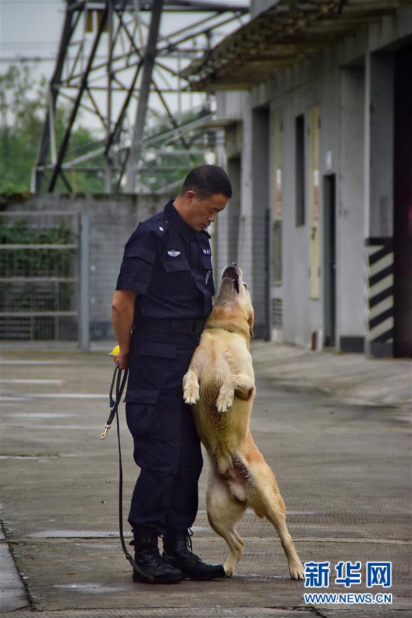 6月24日,緝毒犬“多多”完成訓(xùn)練后,與訓(xùn)導(dǎo)員周吉榮親密互動。 新華社記者 鄭夢雨 攝