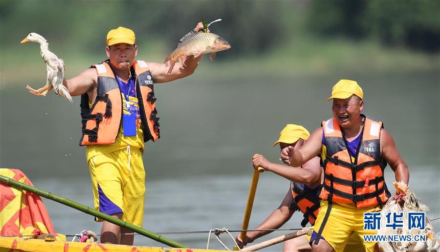 6月25日,參賽選手將放歸漢江中的鴨子、鯉魚抓到手中,引來岸上一片歡呼。新華社記者 陶明 攝