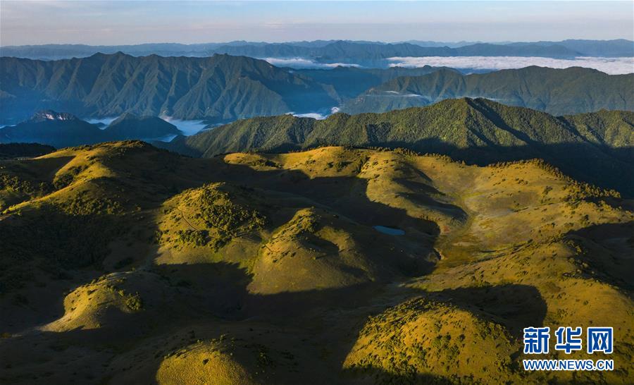 6月30日,朝霞照耀下的神田草甸與遠(yuǎn)處的群峰(無(wú)人機(jī)照片)。位于陜西省安康市嵐皋縣與重慶市城口縣交界處大巴山神田主脊北坡的神田草甸,面積超過(guò)1.1萬(wàn)畝。夏日的朝霞中,起伏的草甸仿佛一塊寬大無(wú)邊的綠色地毯,鑲嵌在大巴山上,如詩(shī)如畫。新華社記者陶明攝