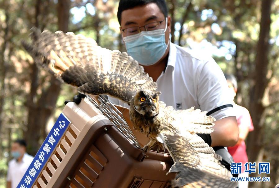 7月1日,吉林省野生動(dòng)物救護(hù)繁育中心工作人員放飛一只長耳鸮。當(dāng)日,吉林省東北虎園舉行放飛活動(dòng),吉林省野生動(dòng)物救護(hù)繁育中心救護(hù)的40只珍稀野生鳥類成功放歸自然。新華社記者林宏攝