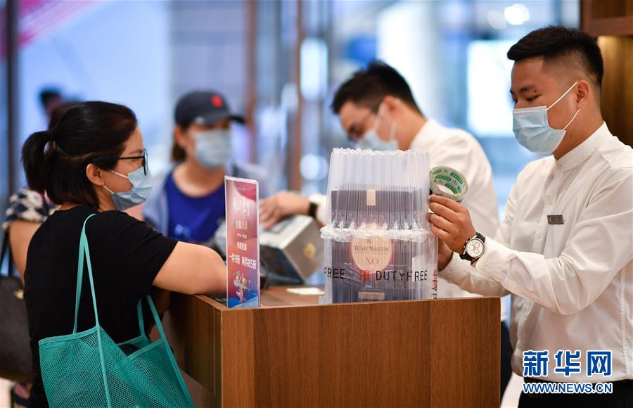 7月1日,??谌赵聫V場(chǎng)免稅店的工作人員為顧客打包酒類(lèi)商品。當(dāng)日,海南開(kāi)始實(shí)施調(diào)整后的離島免稅購(gòu)物政策。海南離島旅客每年每人免稅購(gòu)物額度提高至10萬(wàn)元,電子消費(fèi)產(chǎn)品等7類(lèi)新增商品開(kāi)售。新華社記者郭程攝