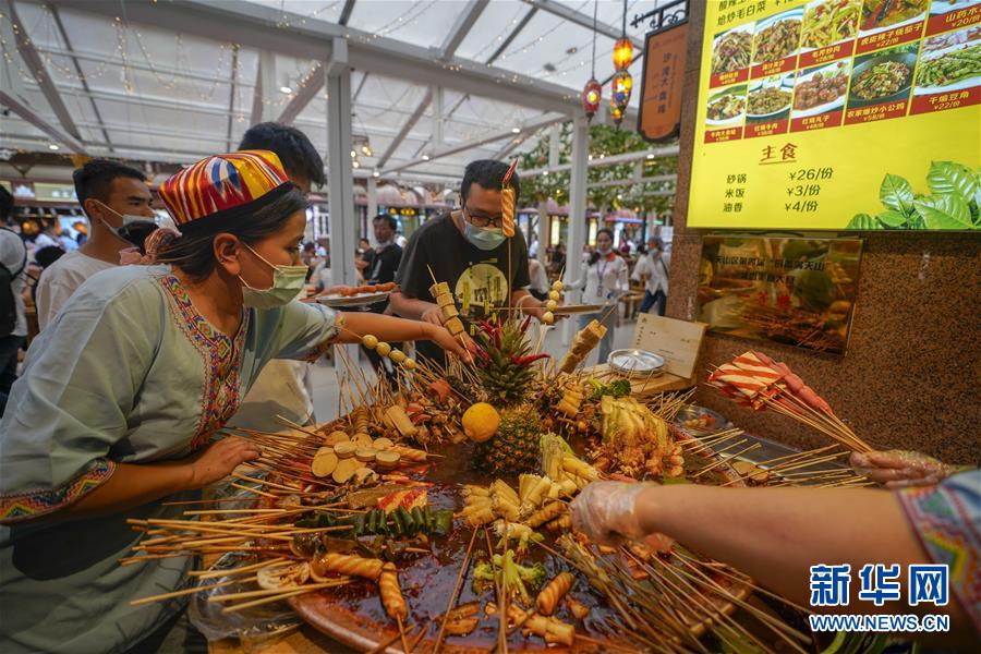 游客在烏魯木齊大巴扎景區(qū)挑選麻辣燙(7月4日攝)。夏日周末,烏魯木齊市大巴扎景區(qū)內(nèi)熙熙攘攘,人們來到這里品嘗美食、休閑購物。2018年,經(jīng)過靚化改造后的大巴扎景區(qū)新增長約800米的步行街,分為文創(chuàng)文旅和“非遺”項(xiàng)目街區(qū)、國際時(shí)尚街區(qū)和大巴扎美食街區(qū),是烏魯木齊最受歡迎的旅游目的地之一。新華社記者趙戈攝