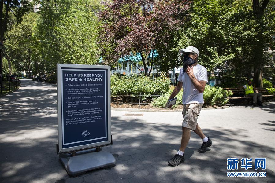 7月6日,行人走過美國紐約一處公園內的提示牌,上面寫有防疫須知和公園管理規(guī)定。