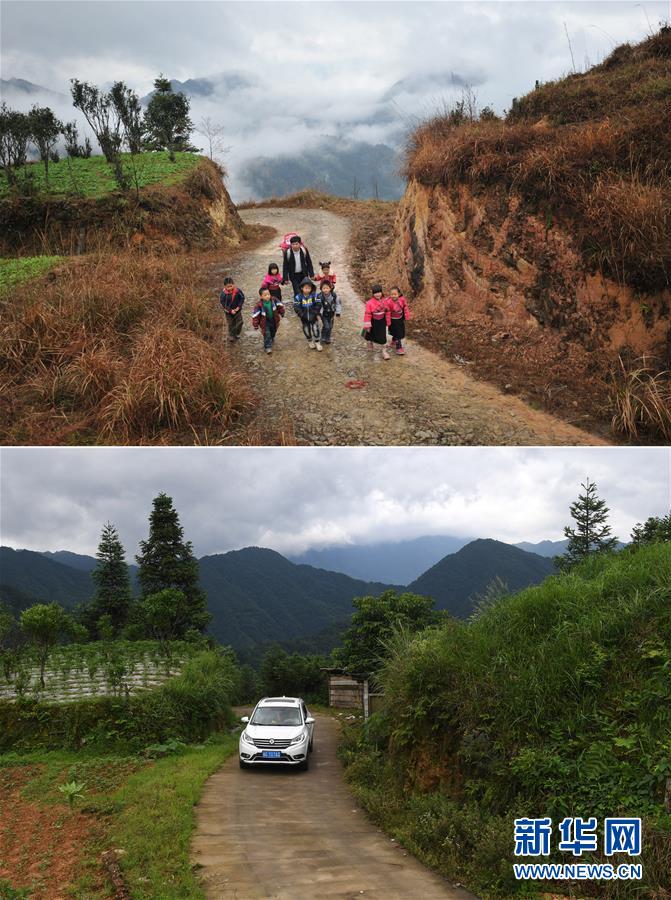 這是一張拼版照片,上圖:在廣西龍勝龍脊鎮(zhèn)江柳村,余啟貴老師背著背簍領(lǐng)著學(xué)生去學(xué)校(2013年2月26日攝);下圖:在廣西龍勝龍脊鎮(zhèn)江柳村,余啟貴老師開著自己的汽車帶著學(xué)生去學(xué)校(7月7日攝)。新華社記者陸波岸攝