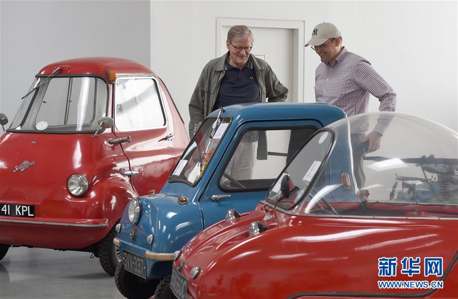 7月8日,兩名男子在奧地利弗森多夫舉行的“迷你”老爺車展上參觀。新華社記者郭晨攝