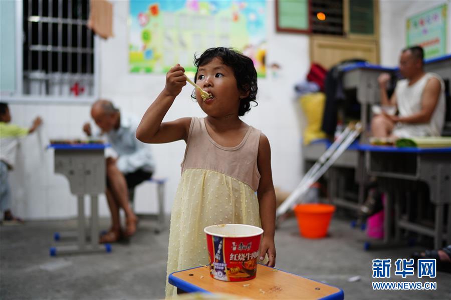 7月9日,小朋友在安置點(diǎn)里吃飯。當(dāng)日,江西鄱陽縣鄱陽鎮(zhèn)因洪水受災(zāi)的村民被轉(zhuǎn)移到多個集中安置點(diǎn)。在鄱陽縣五一中心學(xué)校安置點(diǎn),志愿者和工作人員接到任務(wù)后不到十小時內(nèi),為被轉(zhuǎn)移村民布置了28間教室,供519人安頓,并為村民發(fā)放褥子、床單、枕頭、盒飯、飲用水等物資。新華社記者周密攝