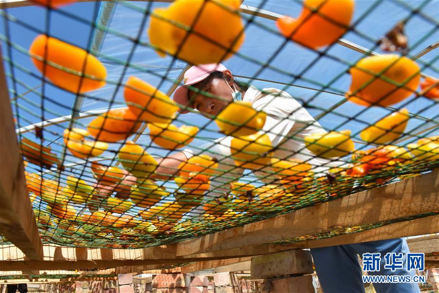 在新疆英吉沙縣一家合作社內(nèi),員工在晾曬杏子(7月2日攝)。新華社記者高晗攝