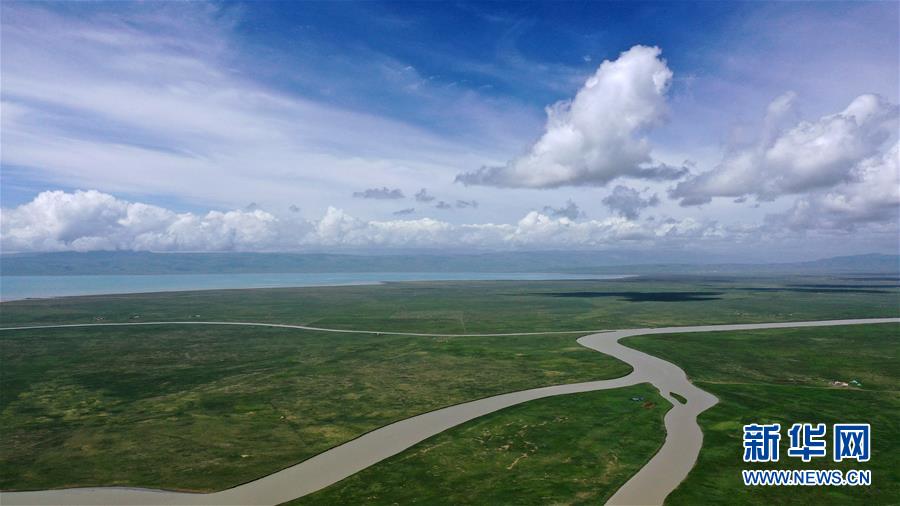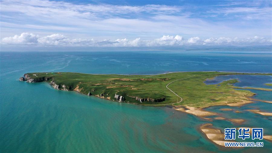 7月10日拍攝的青海湖風(fēng)光(無(wú)人機(jī)照片)。盛夏時(shí)節(jié),被譽(yù)為“中國(guó)最美湖泊”的青海湖畔景色宜人,藍(lán)天、白云、湖水與草原組成一幅壯美的畫(huà)卷。新華社記者 張宏祥 攝