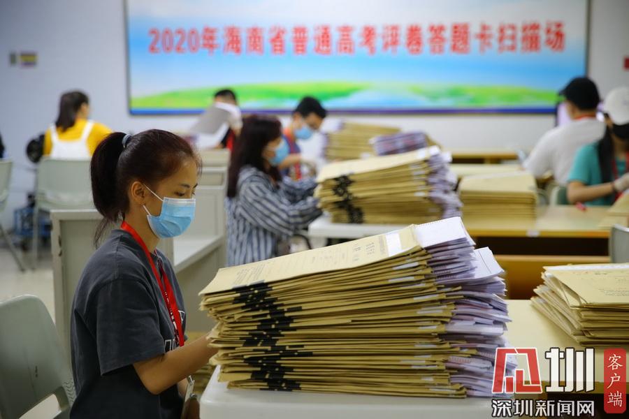 2020年7月13日,在海南師范大學(xué)高考評卷場,工作人員仔細(xì)拆封考卷并進(jìn)行掃描入電腦,整個過程井然有序。在評卷現(xiàn)場的入口,除了有武警把守之外,所有工作人員進(jìn)入到評卷場均有專人使用手柄式金屬探測器對其進(jìn)行安檢,并通過身份證識別系統(tǒng)中進(jìn)行身份識別,方可以進(jìn)入??忌痤}卡由武警24小時值守,并實行嚴(yán)密的視頻監(jiān)控。