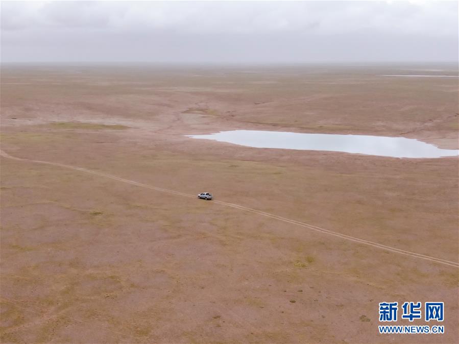 在可可西里索南達杰保護站管護區(qū)域,龍周才加與隊友們乘車巡視(6月30日攝,無人機照片)。新華社記者 張龍 攝