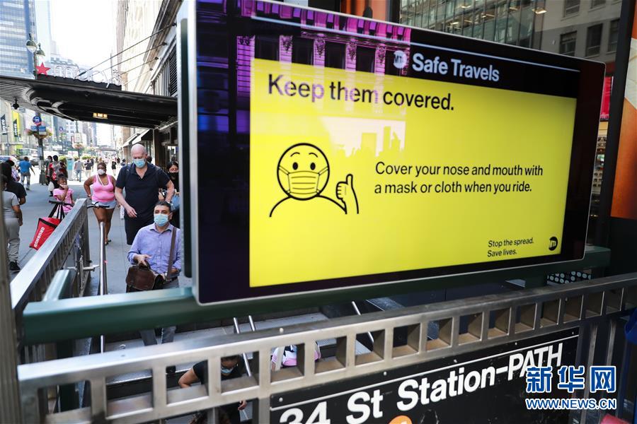 7月14日,人們佩戴口罩進(jìn)入美國(guó)紐約地鐵站。美國(guó)約翰斯·霍普金斯大學(xué):截至北京時(shí)間15日6時(shí)34分,全球新冠確診病例達(dá)13258016例,死亡病例為576752例。美國(guó)是全球疫情最嚴(yán)重的國(guó)家,確診病例達(dá)3416222例,死亡病例為136319例。新華社記者 王迎 攝