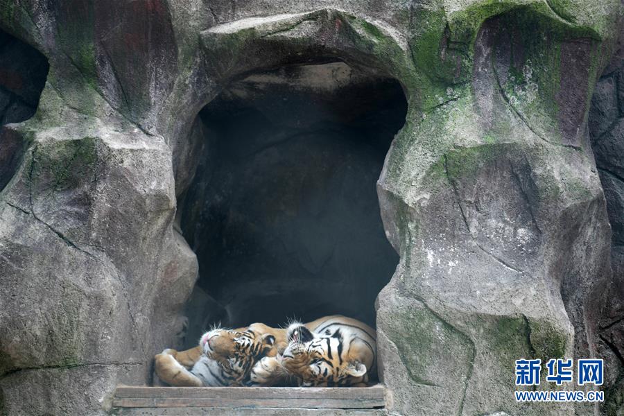 7月28日,在橫道河子?xùn)|北虎林園,東北虎在休息。時(shí)值盛夏,位于黑龍江省海林市的橫道河子?xùn)|北虎林園的東北虎活動(dòng)量減少,以不同方式消夏納涼。新華社記者王建威攝