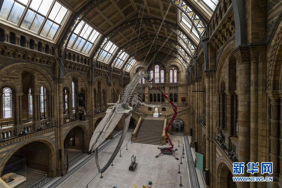 7月27日,工作人員在英國倫敦的自然歷史博物館大廳內(nèi)清潔一具藍(lán)鯨骨架。受新冠疫情影響關(guān)閉數(shù)月的英國自然歷史博物館將于8月5日重新對(duì)外開放,目前館方正在為重新開放做最后準(zhǔn)備。參觀者需要提前預(yù)約參觀時(shí)段、全程佩戴口罩且保持安全距離。新華社記者韓巖攝