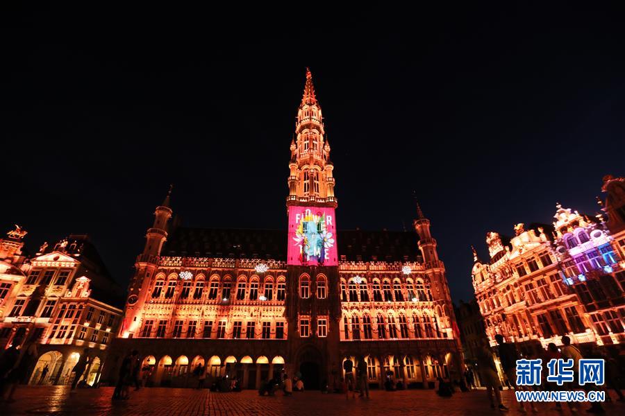 7月29日,人們在比利時布魯塞爾大廣場欣賞聲光秀,市政廳外墻上投射出“鮮花時光”的字樣。7月29日,比利時布魯塞爾大廣場舉行大型聲光秀。藝術家在市政廳等歷史建筑上投影文字和圖案,紀念這個夏天受新冠疫情影響而不能如期舉辦的文化活動。新華社記者鄭煥松攝