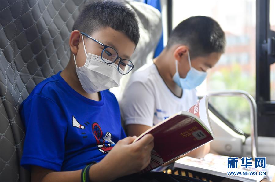 8月5日,小讀者在“流動圖書館”里看書。三千冊圖書,一輛大巴車,穿梭在城市的街頭巷尾。在吉林長春,長春市圖書館利用流動圖書車,定期在市內(nèi)15個固定服務點間巡回流動,為市民提供便捷的圖書借閱服務。新華社記者許暢攝