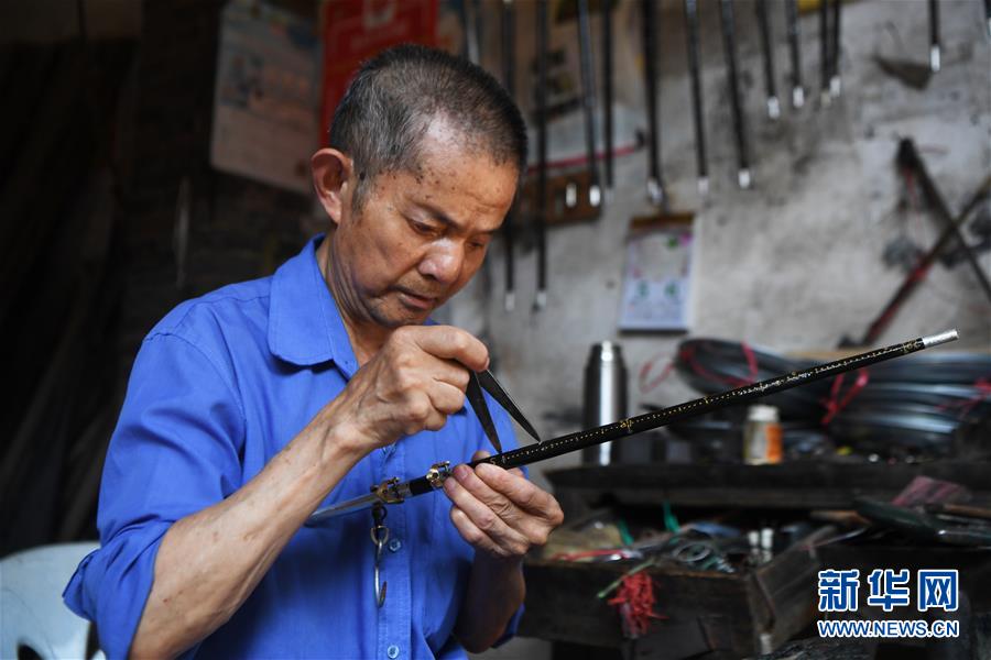 8月5日,豐盛古鎮(zhèn)經(jīng)營秤桿店的居民王澤喜在制作秤桿。近年來,重慶市巴南區(qū)引入社會(huì)資本,按照“修舊如舊、適度開發(fā)”的原則對(duì)豐盛古鎮(zhèn)進(jìn)行保護(hù)性修繕和景區(qū)化打造,讓古鎮(zhèn)在保留原有歷史人文風(fēng)貌的同時(shí),煥發(fā)新活力。新華社記者王全超攝