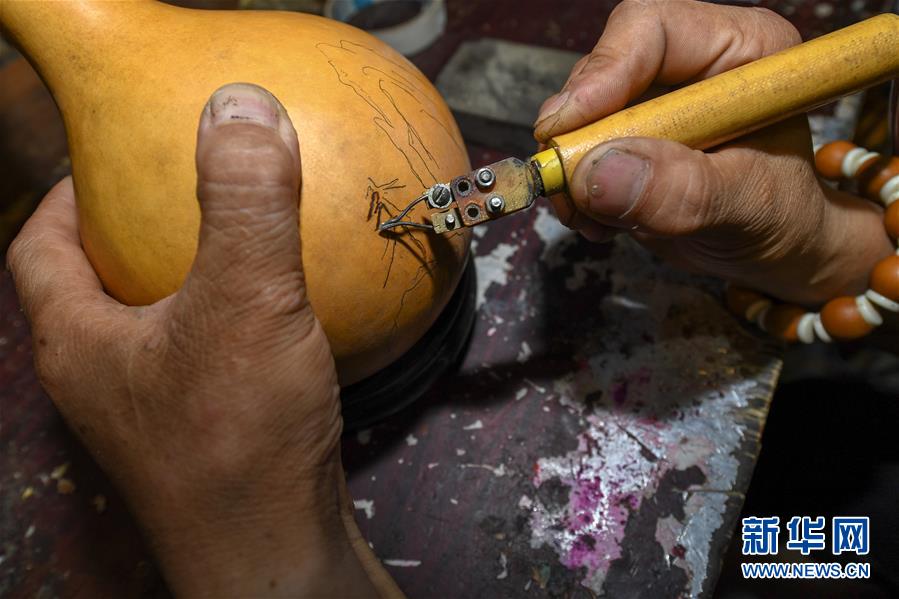 8月5日,侯景偉在葫蘆上進行創(chuàng)作。今年55歲的吉林四平人侯景偉自幼與家人學(xué)習(xí)雕刻、烙畫藝術(shù)。經(jīng)過多年潛心研究,他將浮雕和烙畫工藝相結(jié)合,通過拋光、起稿、雕刻、烙燙、套色等十余道工藝,制作展現(xiàn)傳統(tǒng)文化、民俗故事的葫蘆工藝品。2020年,侯景偉被評為四平市非物質(zhì)文化遺產(chǎn)項目侯氏葫蘆雕刻烙畫代表性傳承人。他說:“希望有更多人加入到非遺傳承隊伍中,讓小葫蘆‘講’出更多民俗故事。”新華社記者張楠攝